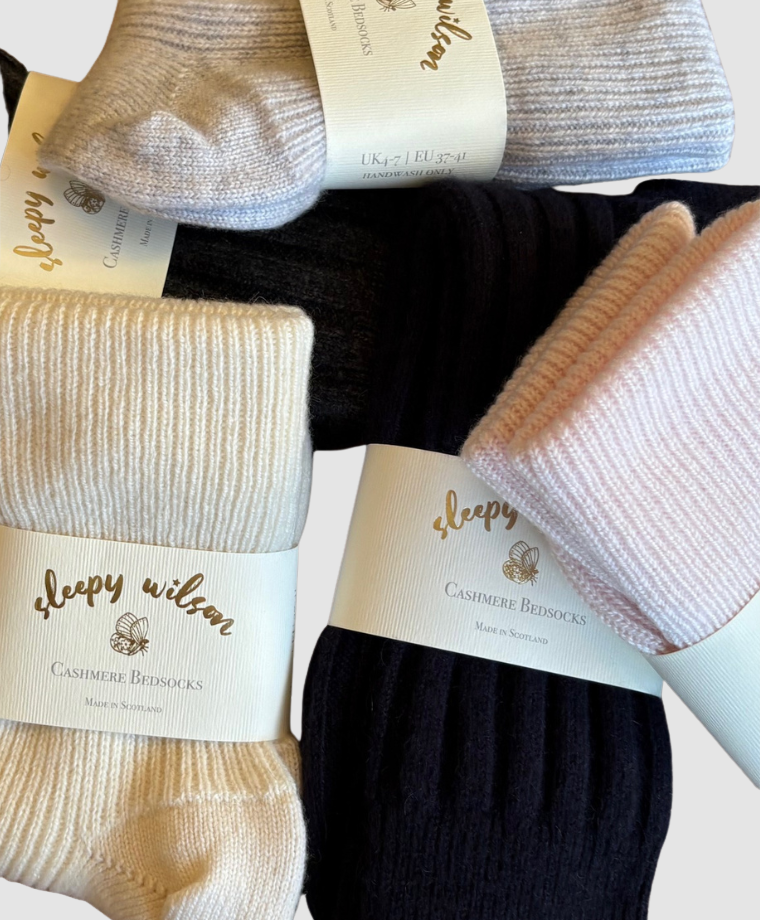 Presented here in the traditional wide ribbed design, our super soft bed socks are made from a 2 ply cashmere where two individual strands are twisted to create the yarn, producing a durable, lightweight but super-soft knit.