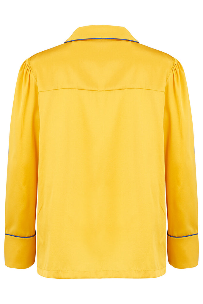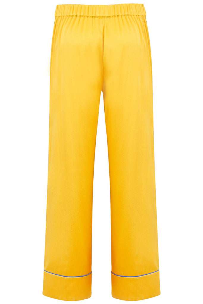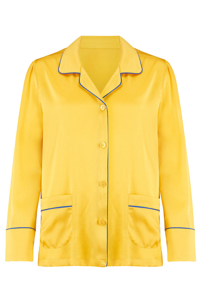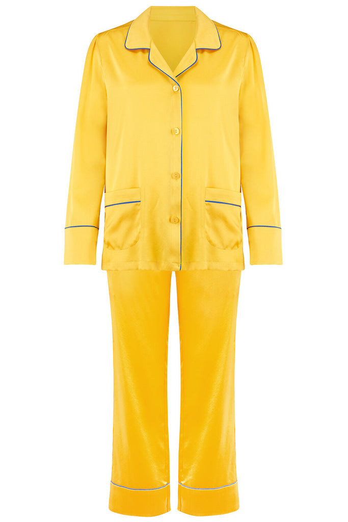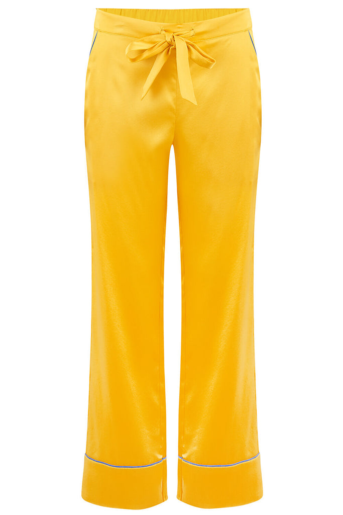 Our classic pyjamas in Honeybee are made from the finest 19 momme silk, trimmed with Peacock blue piping, adjustable waist ribbon and a little extra stretch for the perfect fit.