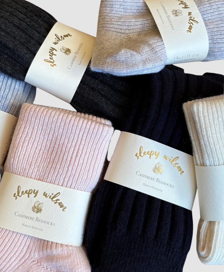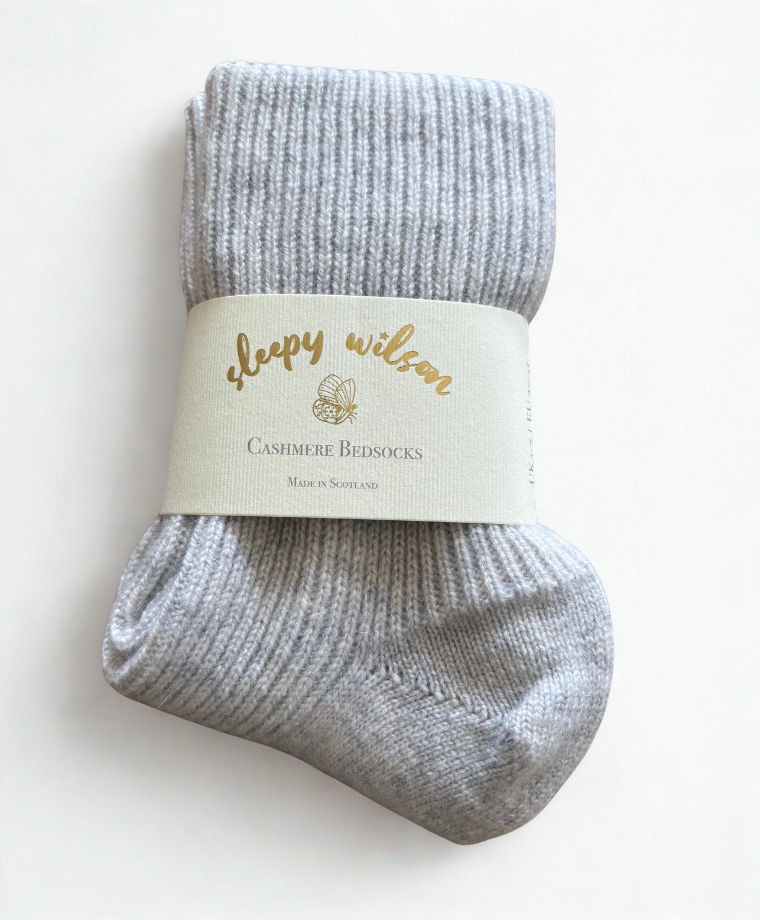 Our super soft bed socks are made from a 2 ply cashmere where two individual strands are twisted to create the yarn, producing a durable, lightweight but super-soft knit.