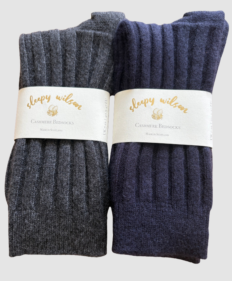 Presented here in the traditional wide ribbed design, our super soft bed socks are made from a 2 ply cashmere where two individual strands are twisted to create the yarn, producing a durable, lightweight but super-soft knit.