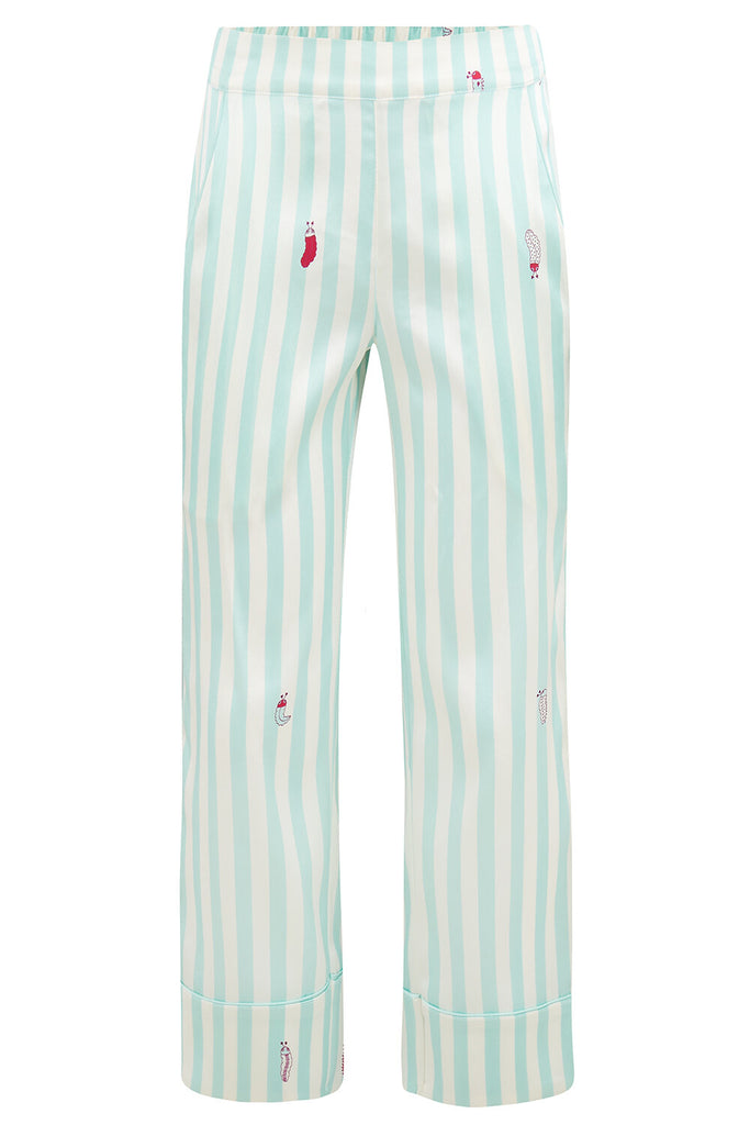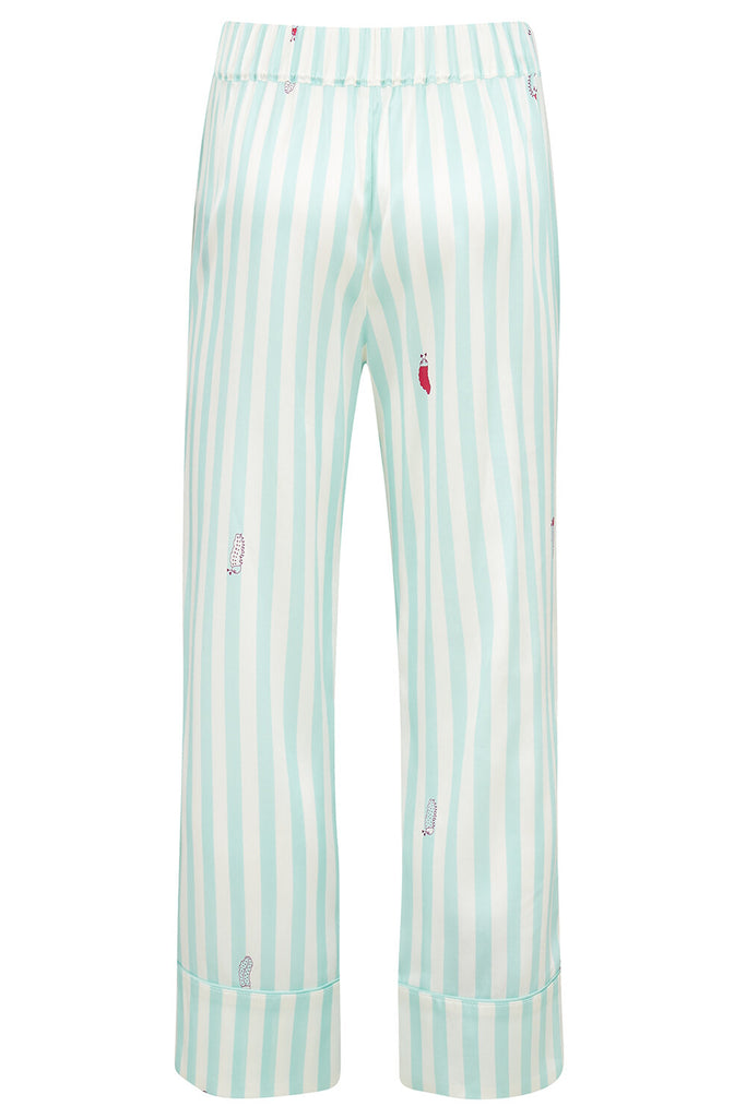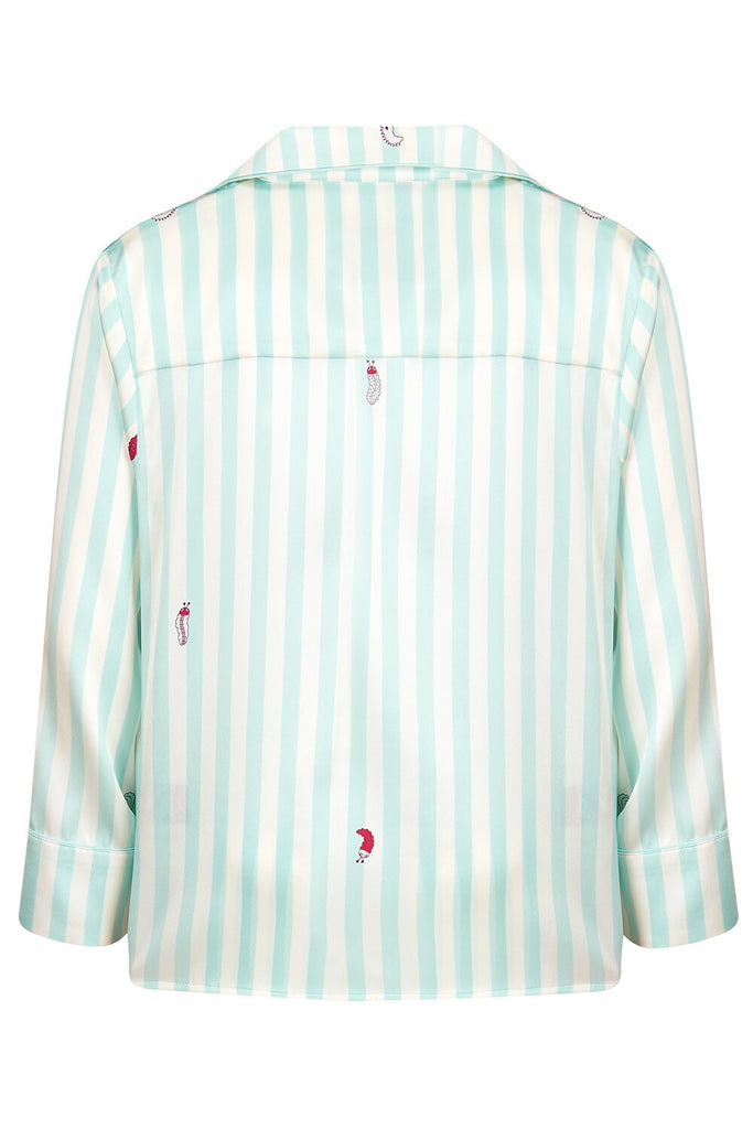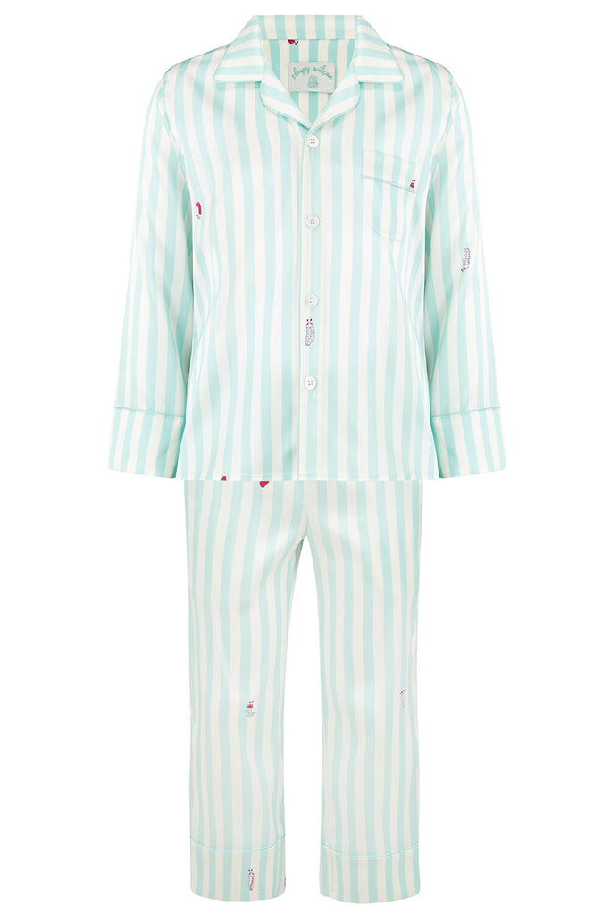 Here we have our Glacier Stripe pyjamas with little red caterpillars made from the finest 19 momme silk, trimmed with matching piping and a little extra stretch for the perfect fit.