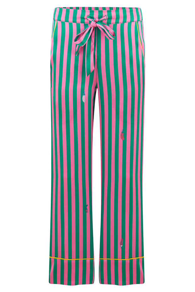 Our classic pyjamas in Flamingo Stripe print, made from the finest 19 momme silk, trimmed with Honeybee piping, adjustable waist ribbon and a little extra stretch for the perfect fit.