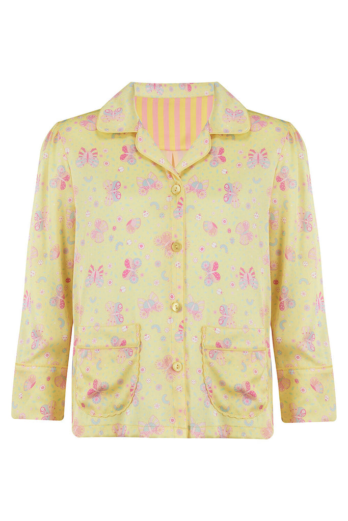 Our classic pyjamas in our Lemonade Butterfly print are made from the finest 19 momme silk, trimmed with matching piping, adjustable waist ribbon and a little extra stretch for the perfect fit.